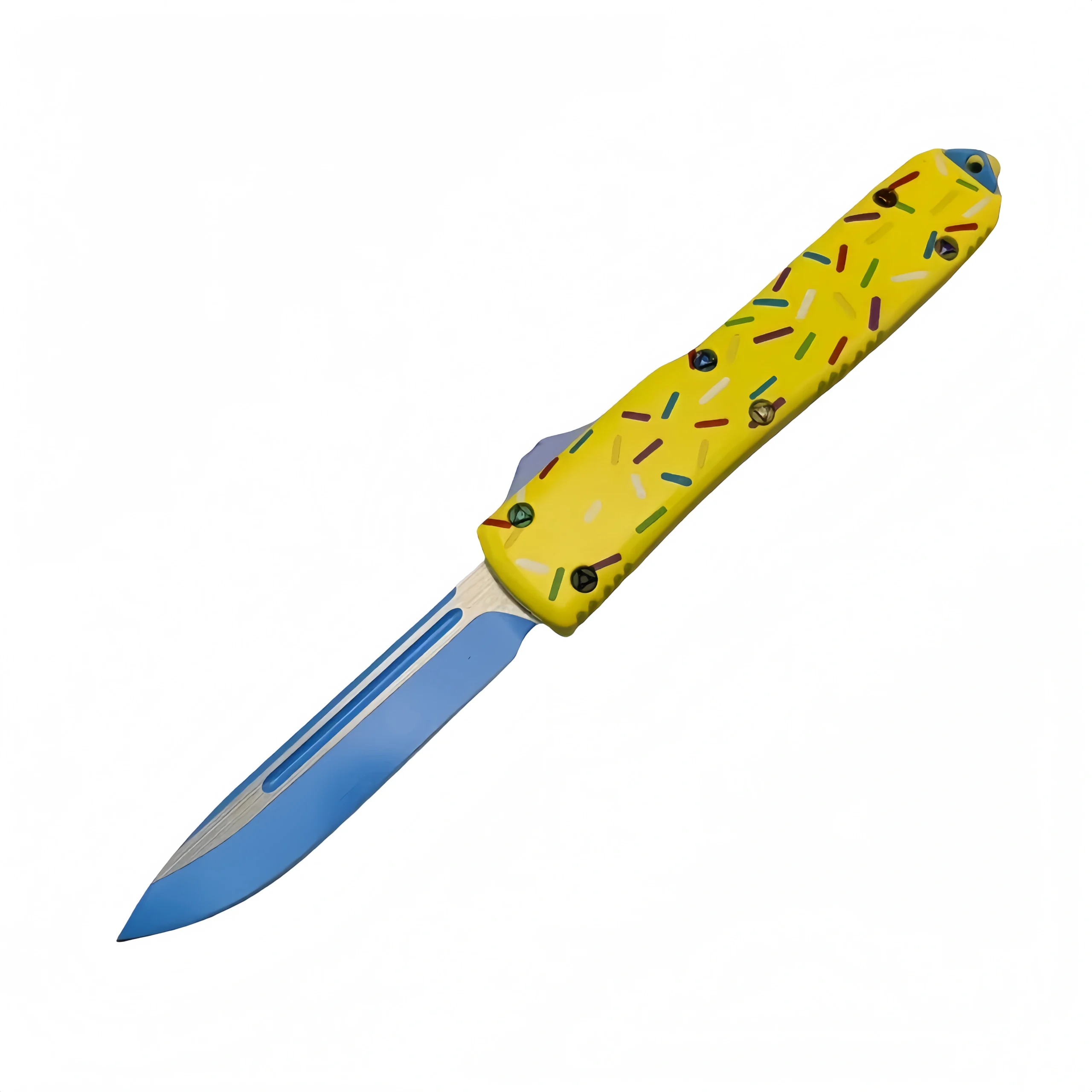 The 5.5″ UTX70 Yellow Series Dessert Warrior OTF Knife brings together playful design and high performance. Featuring a striking yellow anodized handle and a “dessert warrior” motif, this knife combines fun, function, and precision in one compact package. The double-action OTF mechanism provides quick blade deployment with ease, while the ergonomic grip ensures comfort for everyday carry. Whether you’re a collector or someone who enjoys having a unique and reliable tool, this knife is the perfect addition to any EDC setup or display.